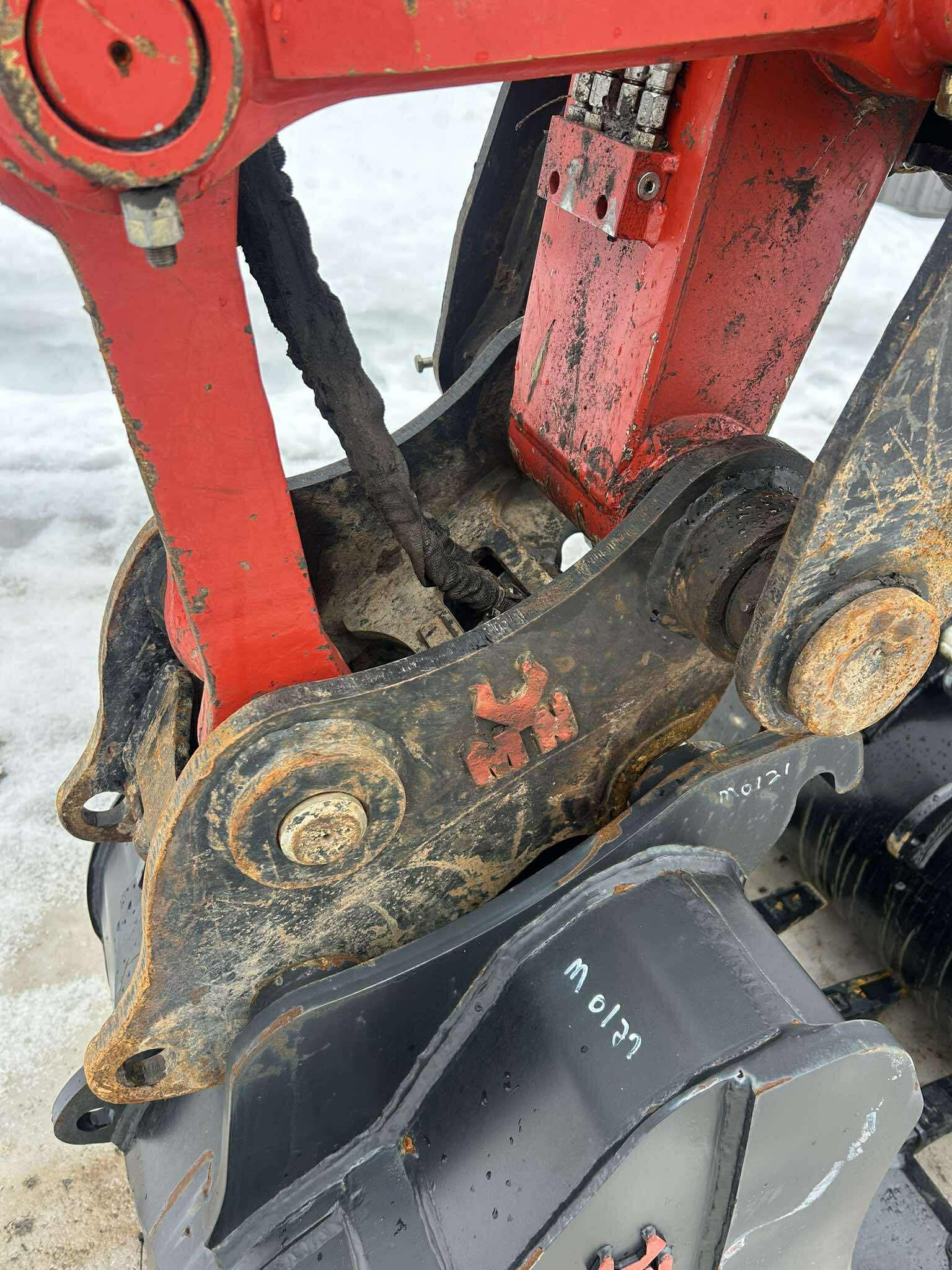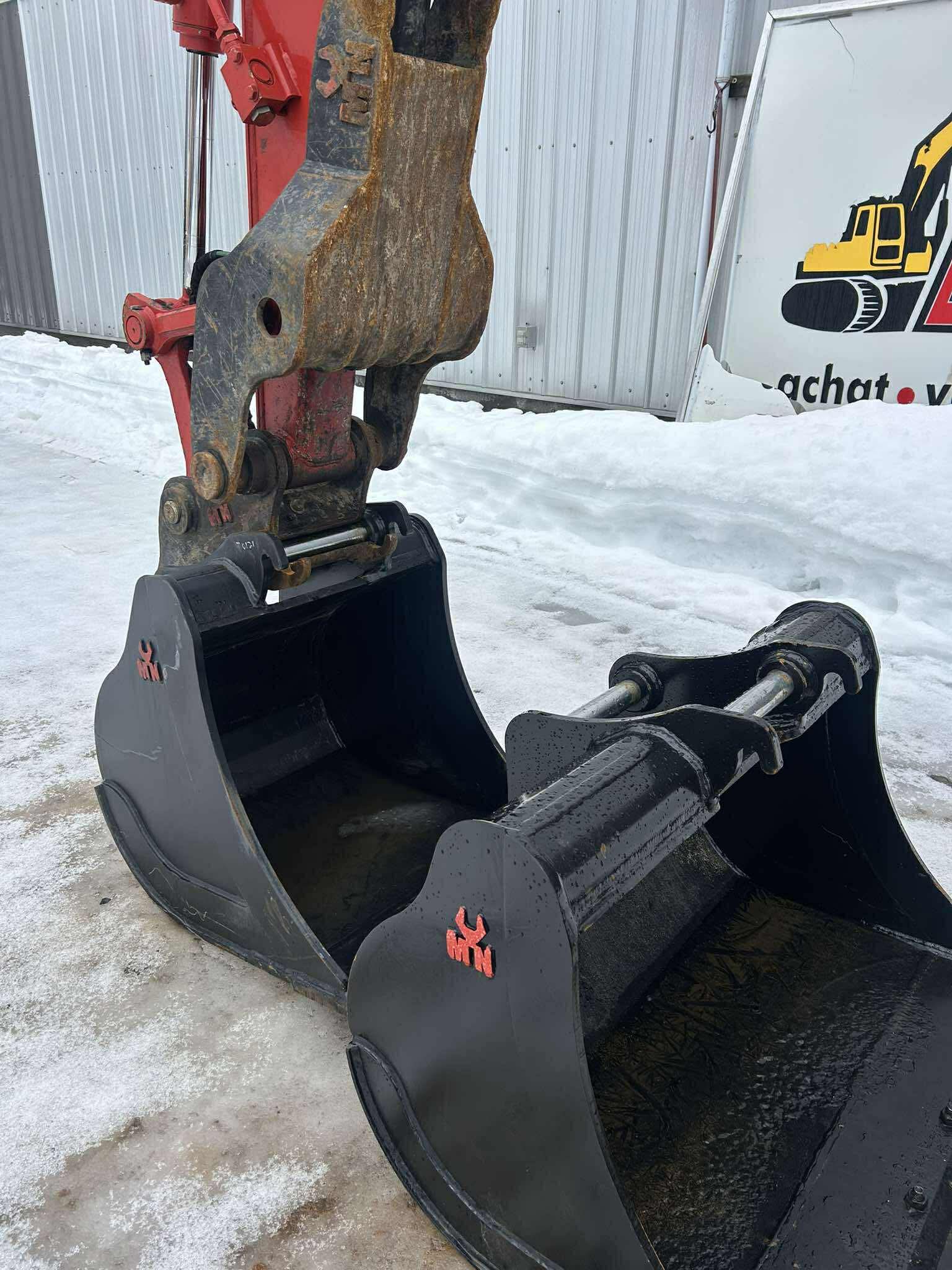 Cette unité est équipée d’une quick attache hydraulique pour un changement rapide des accessoires, d’un pouce hydraulique pour la manipulation de matériaux et vendue avec deux buckets. Elle comprend également une gratte avant, pratique pour le nivelage et les travaux de finition.
